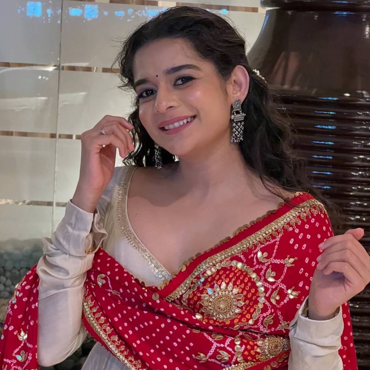 Cream Anarkali Suit with Red Bandhani Dupatta
